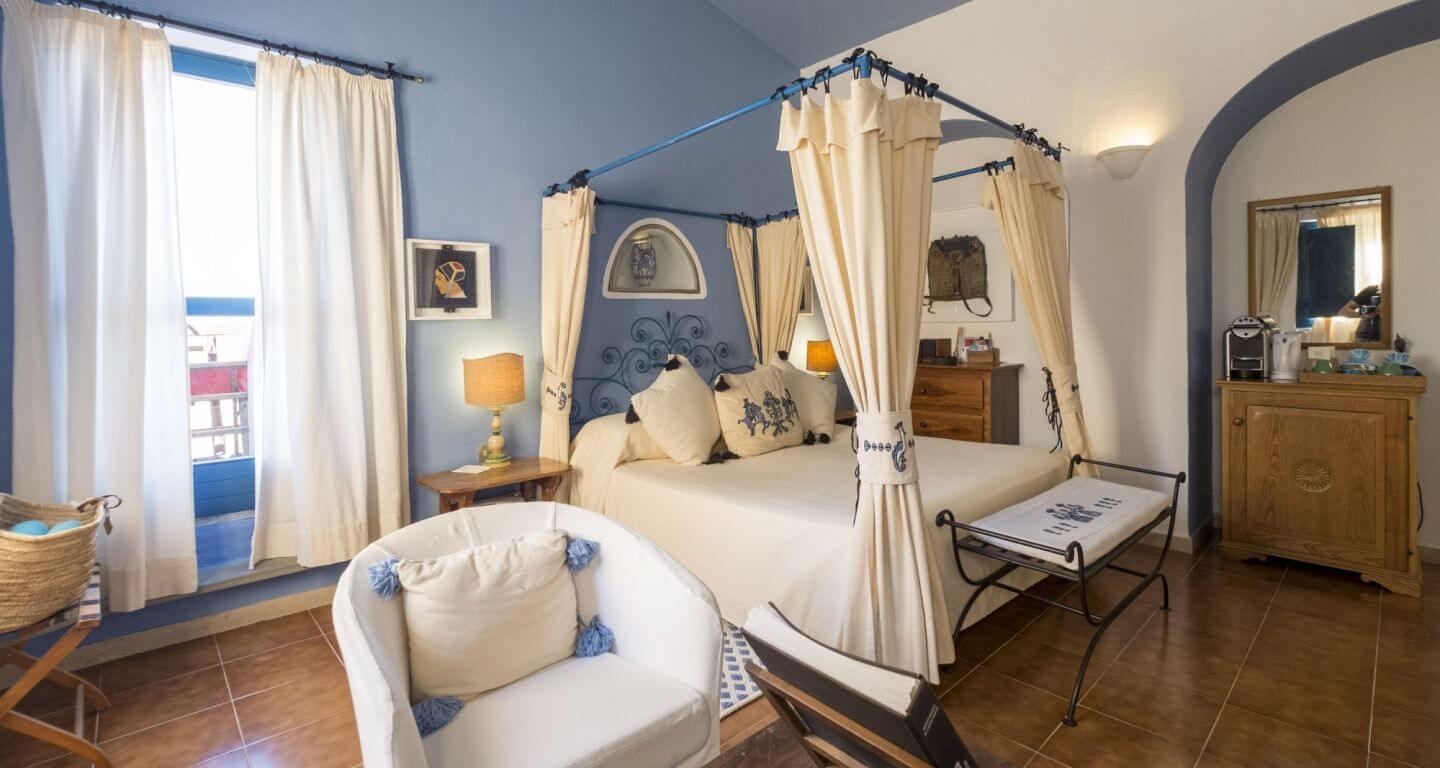 Ognuna dedicata a un grande artista del Novecento sardo come Fedrico Melis, Giuseppe Biasi, Edina Altara. Gli ambienti sono arredati con mobili della tradizione, spesso d’epoca, pezzi autentici dell’autore, libri d’arte e preziosi ricami realizzati dalle abili mani delle donne di Oliena. Alcune sono dotate di una vasca circolare per 2 persone nella piccola area salotto o sulla terrazza. Servizio di coverture serale: le camere vengono riassettate anche in serata. Aria condizionata, minibar, telefono, cassaforte, led tv, asciugacapelli, Nespresso, bollitore, accappatoi, ciabattine. Le nostre junior suite sono tutte diverse e le fotografie sono indicative della tipologia Superficie da 25 a 30 m²